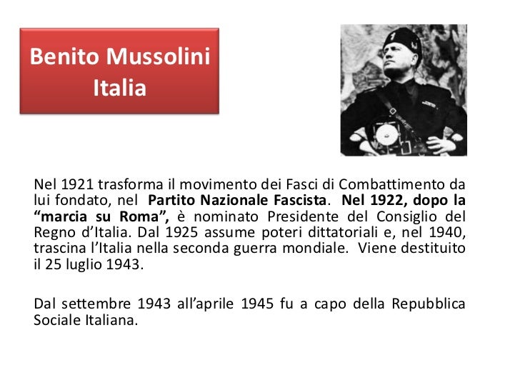 • Benito Mussolini, ex socialista rivoluzionario (e giornalista, espulso dal 1914 per la sua idea interventista, dal giornale passo dal dirigere l'Avanti al Popolo d'Italia), fonda nel 1919 i Fasci di Combattimento: movimento violento, antisocialista (o meglio, inizialmente coniuga socialismo e nazionalismo militarista), antiparlamentare.