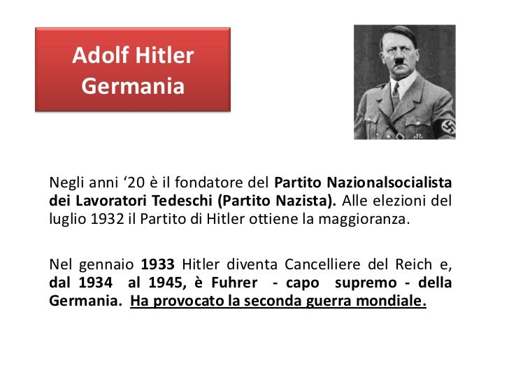 Dal 1933 fino al 1945, Hitler governò la Germania come Führer, instaurando il cosiddetto Terzo Reich (Reich significa “impero” o “regno”. Col primo Reich si intende quello di Ottone I che deriva da Carlo Magno, con il secondo quello di Re Guglielmo nel 1871). Era un regime totalitario, fondato sulla dittatura personale di Hitler, la propaganda di massa, il controllo della società, la repressione di ogni opposizione e la militarizzazione del paese.