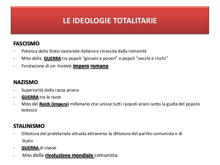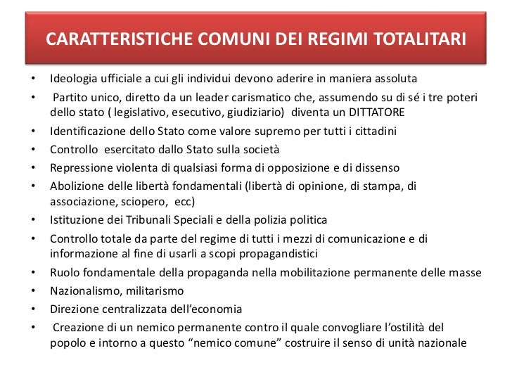 • Lo Stato controlla ogni aspetto della vita pubblica e privata (politica, economia, cultura, educazione, pensiero).