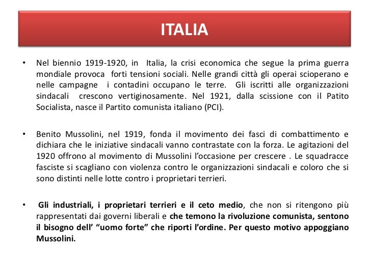 • In Italia, la debolezza liberale e la paura del comunismo portarono all’ascesa del fascismo.